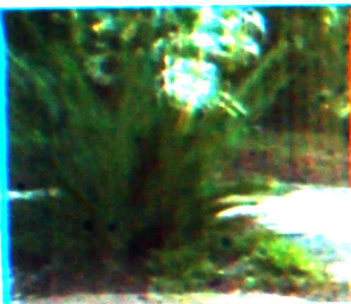 So as you can see it is a reflection, and at first I though "Ah hah!" its light coming from between the branches of the bush being reflected. But, then when I examined it closer you can see there is a fence in the back of the reflection. And the fence is even visible from where the two faces are seen.